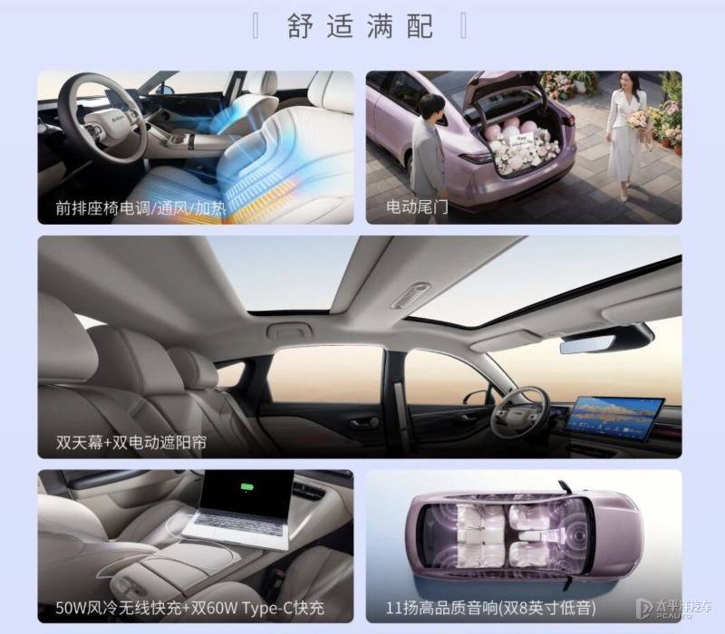 配置方面,埃安AION RT换电版与现款520智豪版一致,配备360度全景影像、电动后备厢、自适应远近LED大灯、全景天幕、50W手机无线充电、前排座椅通风加热、11扬声器音响以及后排空调出风口等配置。